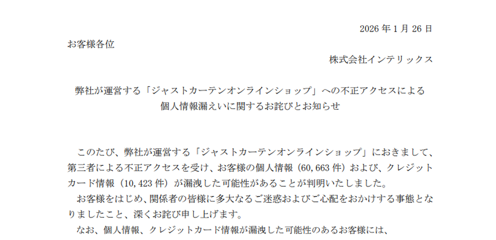 画像:株式会社インテリックスより引用 株式会社インテリックスは2026年1月26日、同社が運営する「ジャストカーテンオンラインショップ」にて、第三者による不正アクセスが発生し、個人情報最大60,663件およびクレジットカ […]